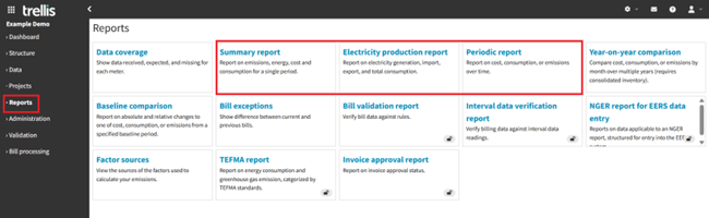 After creating your required benchmarks and benchmark data, you can start implementing them in your Reports.- Summary, Electricity Production and Periodic Reports currently support benchmarking