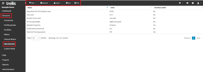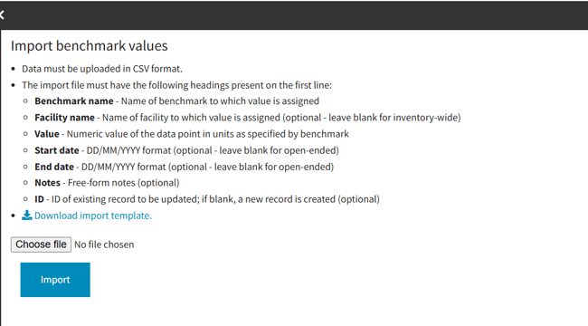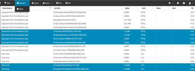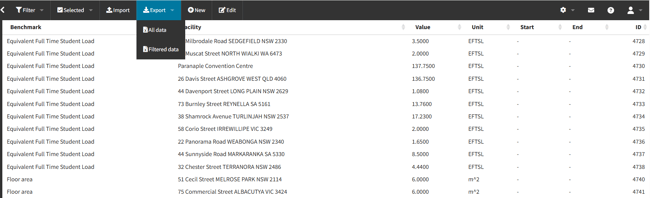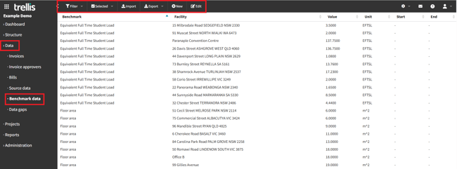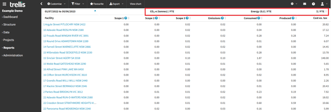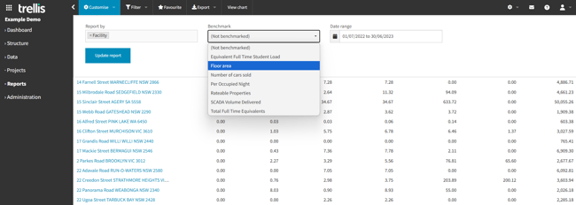Applying benchmarks to a supported report will divide the metrics by relevant benchmark values. Output columns display intensity-based measurements allowing normalised comparisons across facilities of different sizes and types. These values can also be compared for individual facilities or in aggregate across different reporting periods.