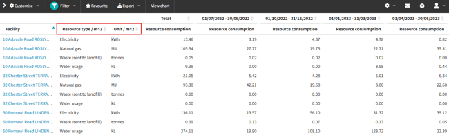 Example Periodic Report comparing quarterly Consumption per m^2 for each facility per resource