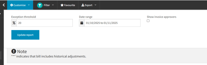 This documentation focuses on features specific to the Bill Exceptions Report. For information about standard reporting capabilities (like customisation, filtering, exporting, etc.), please refer to the General Reporting Guide.