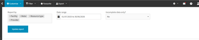 This report always displays data at the meter level to ensure accurate coverage tracking. While other reports allow different aggregation levels, the Data Coverage Report maintains meter-level detail regardless of “Report by” selections. However, your “Report by” choices will determine which columns are visible in the report.
