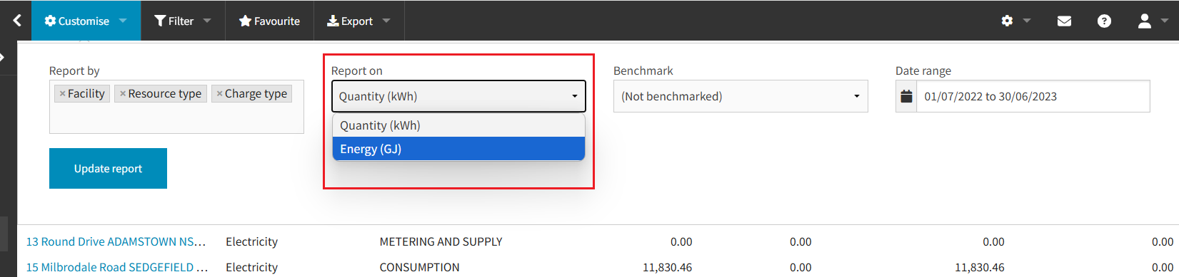 All values are displayed in either kWh or Energy (GJ) based on your selection: