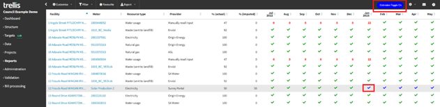 Trellis' Estimations feature enhances report accuracy by filling in missing data using a structured calculation. It allows users to apply an estimation methodology at the meter level, which can be toggled on or off.