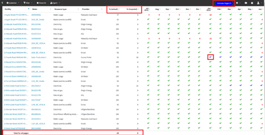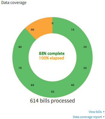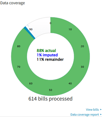 • Actual: The percentage of days covered, counting, out of all valid days for which all meters may have data (i.e. are open, not closed), which days actually have bills covering them. Equivalent to ‘Complete’ before enabling estimations.