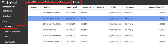 To view the Invoice Details Page for any invoice, select it in the Invoices view and click the “Details” button in the contextual navigation bar at the top of the page.