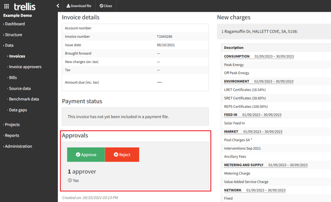 If you are an Approver for this invoice (nominated in the associated meter), you will see “Approve” and “Reject” buttons on the invoice details page, allowing direct action.