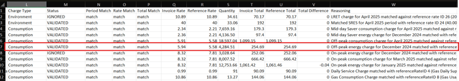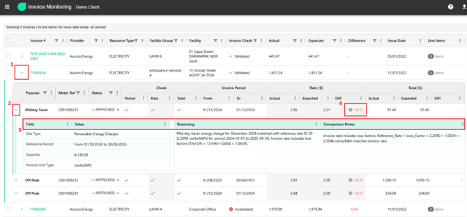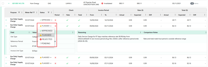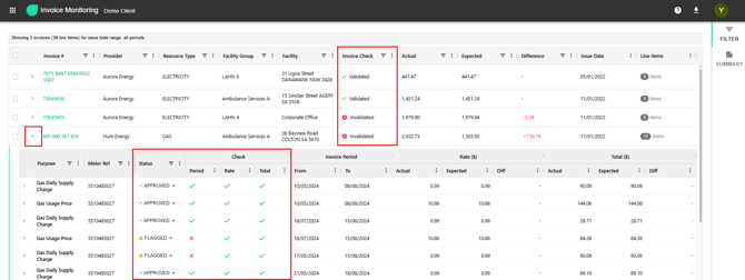 The Invoice Monitoring module allows users to verify that they are being billed the correct rates and amounts by suppliers. Instead of manually checking each rate and calculation, the system compares utility invoice line items against expected reference rates. A default status is assigned after initial validation, which the user can self-modify after evaluating the reasoning notes displayed.