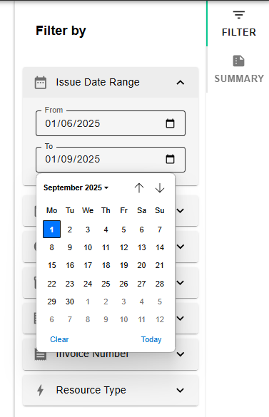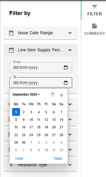 The range is blank by default. Setting a date range in this filter will hide any line items within the invoices that do not have a supply period that falls within the set range.