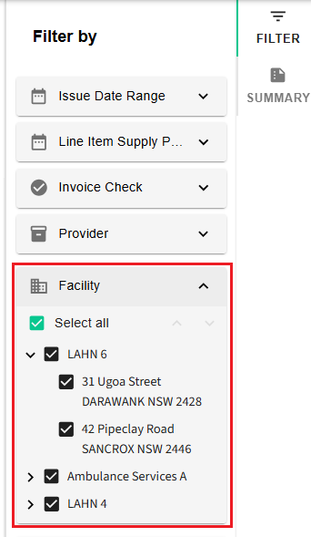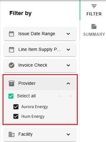 The items available under each filter will be determined by the available data that has been run through validation. For example, if you have 10 facilities in your inventory, but invoices only have come in for validation for 6 of those facilities, you will only see those 6 facilities listed in the filter.