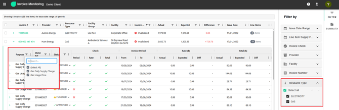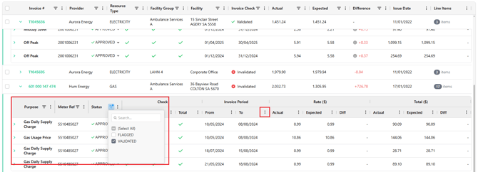 Within an invoice view dropdown, columns can be filtered by clicking the funnel icon. This can be useful for consolidated invoices, allowing closer comparison of specific purpose lines, meters within the invoice, or filtering flagged rows only. A blue dot will appear against the funnel icon if the column currently has a filter active and is not displaying the full data set.