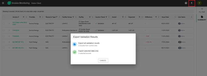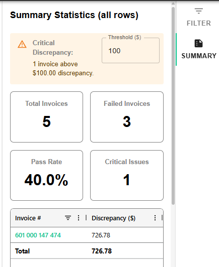 The summary panel provides an aggregated overview of your validation results, displaying key metrics designed to give you quick insights into your invoice monitoring status. The table dynamically adjusts its display based on your selection, allowing for both broad analysis and focused review of specific lines.