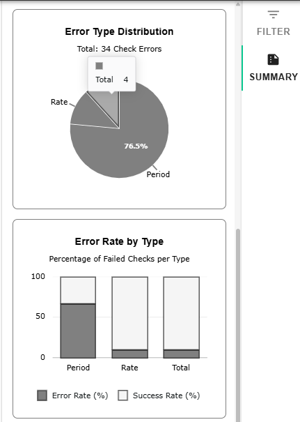 Error Type Distribution chart displays the percentage and count of each type of error (total / period / rate) out of the total number of check errors.