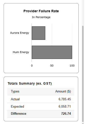 Totals Summary is a sum total of all of the invoices in the applicable data set, showing the sum total difference between actual and expected charges (ex GST)