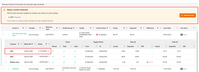 Note that if an invoice has any line items with PENDING, REJECTED or FLAGGED status, the overall invoice status will automatically be set to INVALIDATED