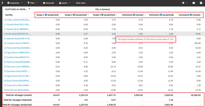 • The total actual, imputed (estimated), and projected amounts will be displayed at the bottom of the table. For more information about each of these options or the estimation feature, please refer to the estimations documentation.
