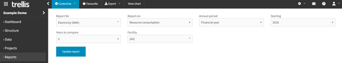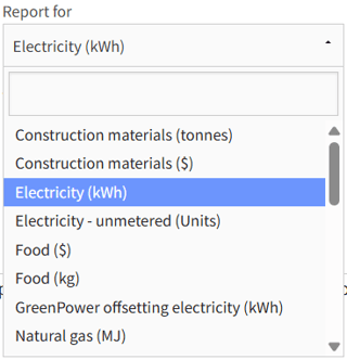 Report for Electricity (kWh) → Options include resource types + measurement units