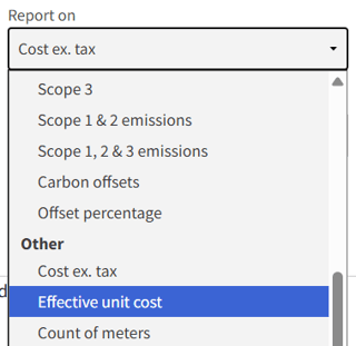 - Select “Report on” to choose a metric to include in the comparison. There are a large variety of measures in both aggregate (e.g.. total consumption) and calculated (e.g.. avg daily cost) you can explore.