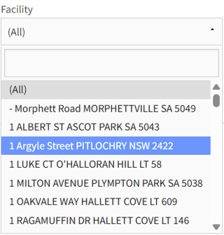 - If you would like to review a specific “Facility”, select it from the drop down menu (searchable and sorted alphabetically). Otherwise leave this field set to “(All)” to include data from across your inventory.